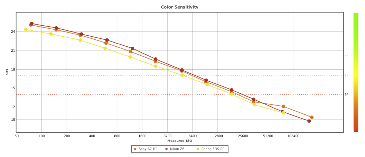 Throughout much of the lower- to mid-range (to ISO 3200), the RP is consistently around 0.8-1.2 bits lower than the Sony and the Nikon sensors, but the gap narrows after that, particularly compared with the Sony. This difference isn’t going to be noticed in everyday scenes, but it may be visible in some extreme cases. The RP’s RAW images meet our high-quality guidelines for color depth at ISO 25,600, as do both rivals. After that, all three models just drop below our 14-bit acceptable quality threshold when set to ISO 51,200 (manufacturers’ settings).
